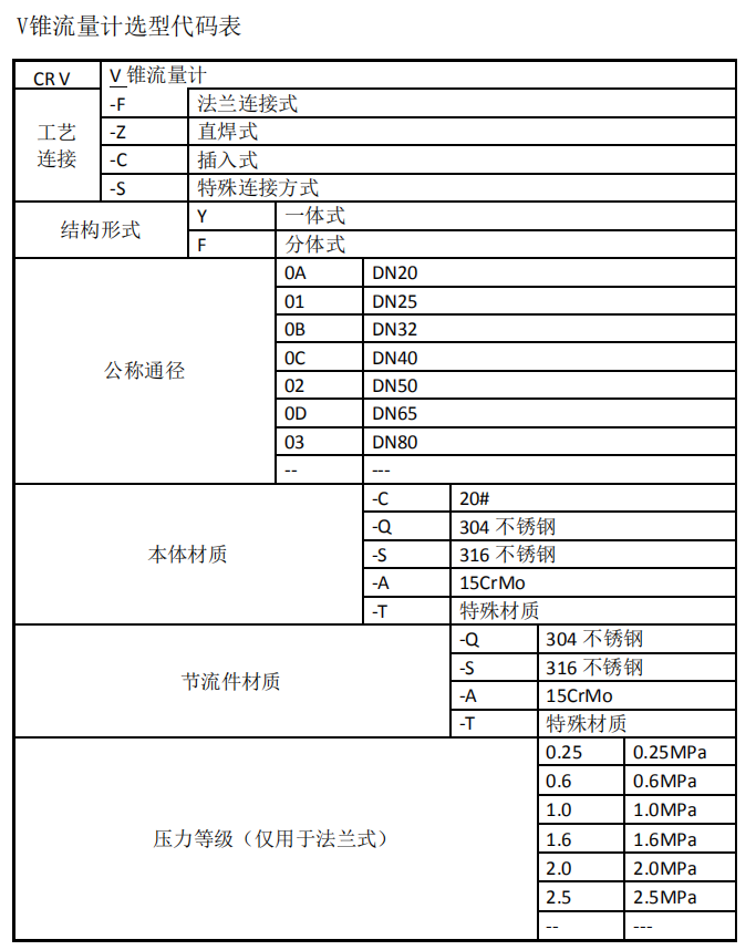 例:CR V-F Y 04 -C -Q 1.6 : V锥流量计,一体式法兰连接,公称通径为DN100,本体材质为20#,节流件材质为304,压力等级 1.6MPa。