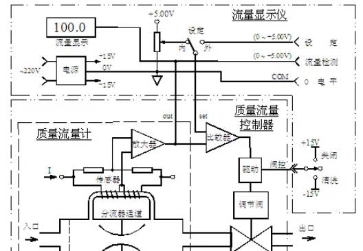 气体质量流量控制器是由流量传感器、分流器通道、流量调节阀门和放大控制器等部分组成。质量流量控制器的剖面结构图见图