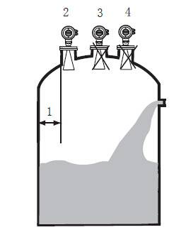 ● 建议距离(1)罐体内壁至安装短管的外壁应大于罐直径的1/6;● 离罐壁Z小距离为300mm;● 不能安装在入料口的上方(4)。● 不能安装在中心位置(3),如果安装在中央,会产生多重虚假回波,干扰回波会导致信号丢失。● 如果不能保持仪表与罐壁的距离,罐壁上的介质会黏附造成虚假回波,在调试仪表的时候应该进行虚假回波存储。 3.2 罐内安装