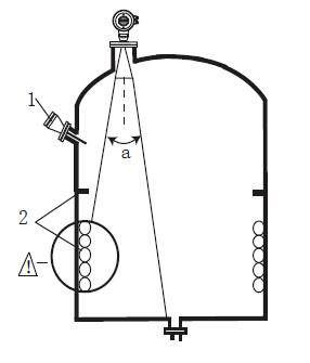 ● 在 信号波束内, 应避免有如下安装物(1):例如限位开关,温度传感器等。● 对称装置(2),如真空环,加热线圈,挡板等等。● 如果罐内有(1)(2)干涉物件,应采用导波管进行测量。 3.3安装选择● 天线尺寸:天线越大,波束角越小,干扰回波将越弱。● 天线调整:将天线调整到测量位置。(见样本第8页)● 导波管:导波管安装用来避免干扰回波。(见样本第9页)
