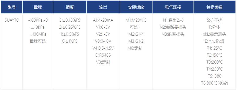 SUAY70 高温压力变送器采用耐高温的硅-蓝宝石技术的感压膜片作为核心,匹配特殊的温度补偿和片上线性修正技术,使其在宽泛的温区内有着良好 的综合性能。蓝宝石材料对温度变化极不敏感,可在-40 至380℃的高温下,也有着ji佳的弹性力敏特性,不会产生疲劳、滞后、PN 节漂移等现象,并且抗辐射性能优异。耐磨损,抗疲劳的钛合金感压膜片,使该系列产品不仅可以承受高温,更兼具良好的耐用性、抗冲击性。利用β相高温力敏材料与合理的结构设计,可将温度扩展至 450-850℃。