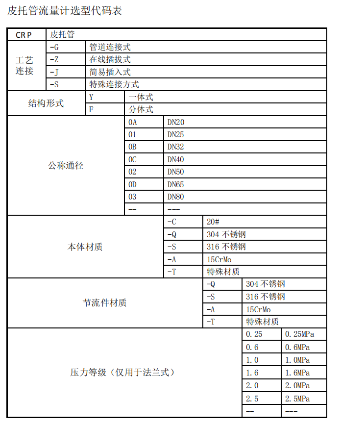 例:CR P -Z Y 04 -C -Q 1.6    皮托管流量计,一体式在线插拔型,公称通径为DN100,本体材质为20#,节流件材质为304,压力等级 1.6MPa。想要了解更多产品详细内容请咨询客服。
