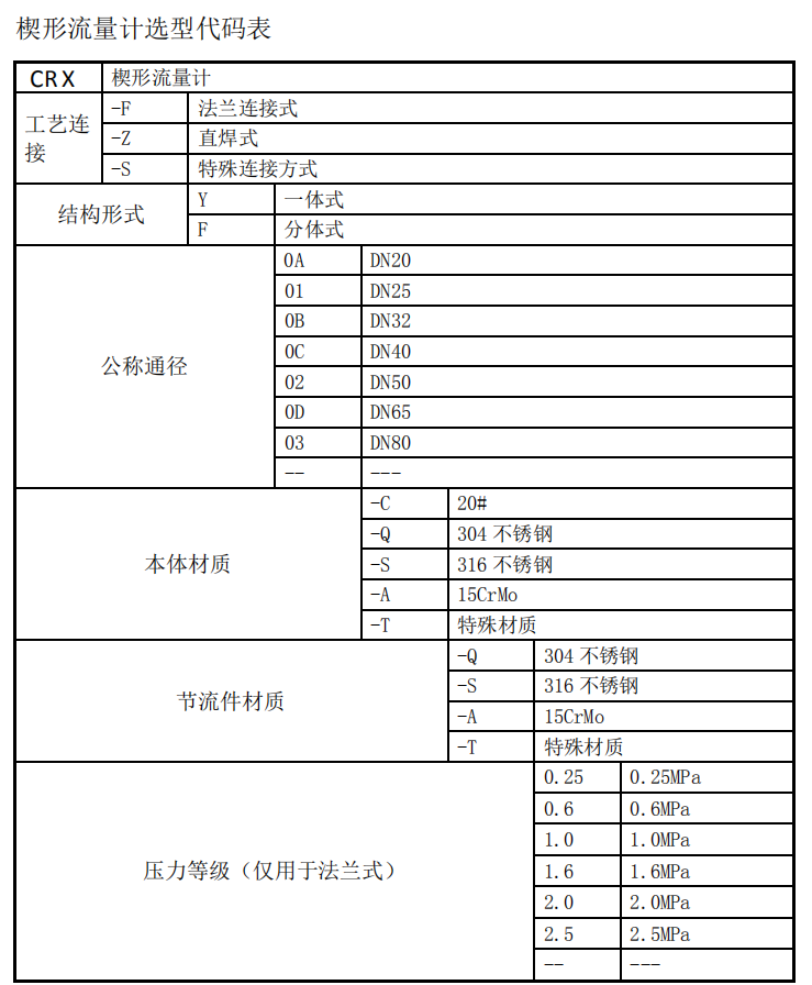 例:CR X -F Y 04-C -Q 1.6  楔形流量计,一体式法兰连接,公称通径为DN100,本体材质为20#,节流件材质为304,压力等级 1.6MPa。以上就是CRX系列楔形流量计产品详细介绍。